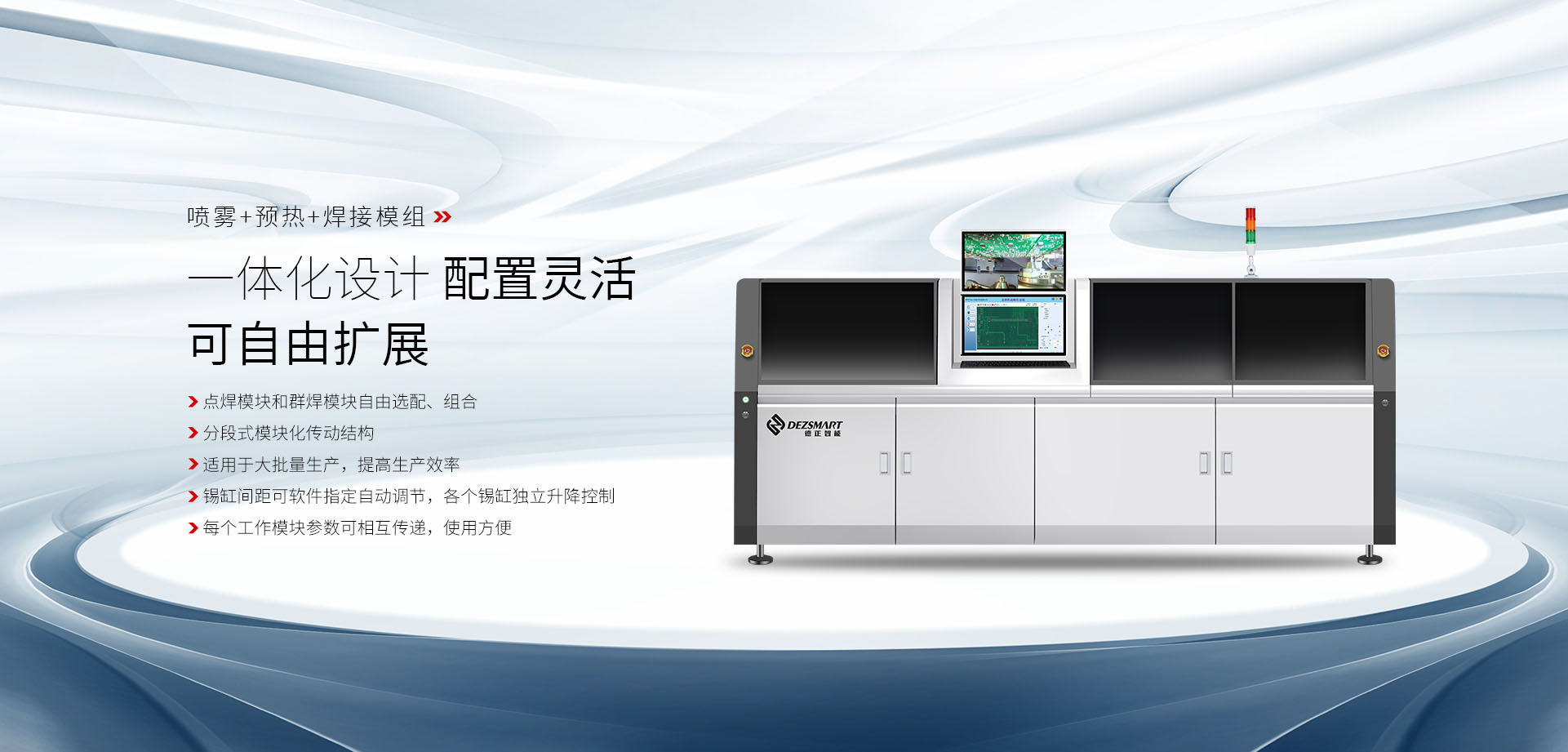 深圳市德正智能科技有限公司是一家專業(yè)從事自動(dòng)化設(shè)備的創(chuàng)新型科技企業(yè)。公司擁有高素質(zhì)、經(jīng)驗(yàn)豐富的研發(fā)人員,其核心團(tuán)隊(duì)具有多年從業(yè)經(jīng)驗(yàn),為各電子行業(yè)提供完整的整線自動(dòng)化解決方案。公司目前主要針對(duì)整線自動(dòng)化設(shè)備領(lǐng)域,在智能焊接、自動(dòng)清洗、自動(dòng)化檢測(cè)及非標(biāo)自動(dòng)化設(shè)備方面擁有完整的解決方案。德正智能產(chǎn)品廣泛用于航空、航天、汽車電子、智能手機(jī)、平板電腦、家用電器、工業(yè)控制、線束加工、LED及SMT等各個(gè)行業(yè),客戶遍及華南、華東、華北、福建、西南、西北地區(qū);產(chǎn)品出口到歐洲、臺(tái)灣、越南、印度、馬來西亞等地。德正智能以完整的產(chǎn)品線、廣泛的客戶群、穩(wěn)定的產(chǎn)品性能獲得了眾多客戶的好評(píng)。德正智能全體員工將以“新技術(shù),新服務(wù),新發(fā)展”為理念,建立具有高水準(zhǔn)的智能自動(dòng)化系統(tǒng)。以環(huán)保節(jié)能、人性化、自動(dòng)化為創(chuàng)新宗旨,不斷創(chuàng)造新產(chǎn)品,優(yōu)化產(chǎn)品性能,實(shí)現(xiàn)全面質(zhì)量管理架構(gòu)。以誠(chéng)信為本、互惠互利、全面的優(yōu)良品質(zhì)、永續(xù)經(jīng)營(yíng)的理念,···
