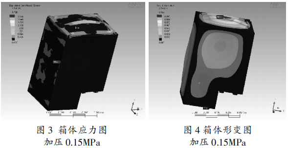 箱壁厚度滿足材料的許應(yīng)應(yīng)力要求及氣箱允許變形量要求。通過軟件分析計算后得到氣箱的應(yīng)力分布(見圖3)及箱體形變(見圖4),最終找到氣箱壁厚。