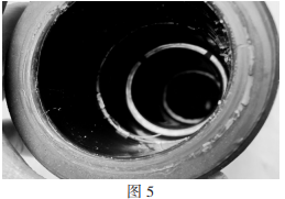 事故分支箱電纜終端所使用的硅脂密封功能不良,故障發(fā)生后,當(dāng)拆撥其它兩相電纜頭時(shí),由于硅脂出現(xiàn)干枯粘結(jié)(如圖5),需要多人合力才干撥出,可見(jiàn)硅脂已不能起到潤(rùn)滑防潮與絕緣的作用,不能與電纜頭同“呼吸”,彈性功能大為下降。