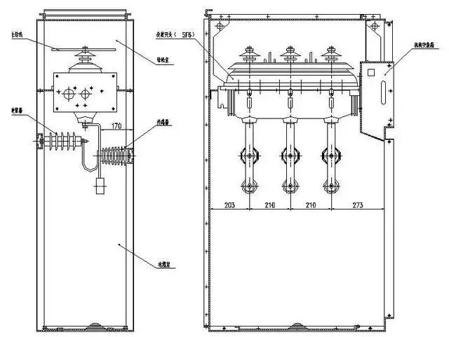 b、開關室由密封在金屬殼體內的各個功用回路(包括接地開關和負荷開關)及其回路間的母線等組成。殼體由3㎜冷軋鋼板(或不繡鋼板)焊接而成。每一個功用回路包括一臺負荷開關和接地開關。負荷開關是由筆直運動的動觸頭體系和坐落下端的靜觸頭組成,開關合閘時,動觸頭向下運動,負荷開關接通。接地開關由動觸刀和靜觸刀組成,在繃簧運動過程中,接地開關快速接通。開關室上部和后部開有4個長方形安裝工藝孔,環網柜的正面裝有觀察窗,可看到接地開關的“分”、“合”方位。在環網柜的后部裝有防爆設備。