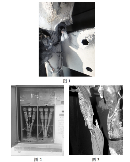 2008年3月24日,回南天,富灣站富油乙線速斷跳閘,位于戶外的一臺(tái)電纜分支箱發(fā)生短路爆炸(如圖1),601開關(guān)出線電纜倉(cāng)門嚴(yán)峻熏黑,翻開后發(fā)現(xiàn)A相電纜終端應(yīng)力錐焚毀,纜芯熔損,開端剖析主要為施工工藝粗糙,形成電纜終端電場(chǎng)畸變嚴(yán)峻,同時(shí)纜身緊靠固定用金屬支架,在箱內(nèi)潮濕環(huán)境下發(fā)生長(zhǎng)時(shí)間閃絡(luò)放電,最終絕緣破損接地短路,將出線套管炸壞,形成氣室漏氣,分支箱作廢。