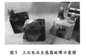 20113300:38,35kV垣潔線、35kV垣宏回AB相電壓互感器擊穿,如圖5所示;201232619:7:58,35kV垣潔線56號線路電壓互感器ABC相損壞,AB相有炸裂現象。
