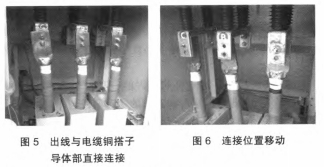 穿墻套管下部為出線,與電纜銅搭子導體部直接聯接,如圖5所示。吊銷聯接螺栓后產生聯接方位移動,如圖6所示。此現象闡明電纜銅搭子與穿墻套管存在很大的聯接變形,并產生應力,在電纜通電后產生的電動力和聯接應力進一步效果于穿墻套管,使得穿墻套管產生碎裂。